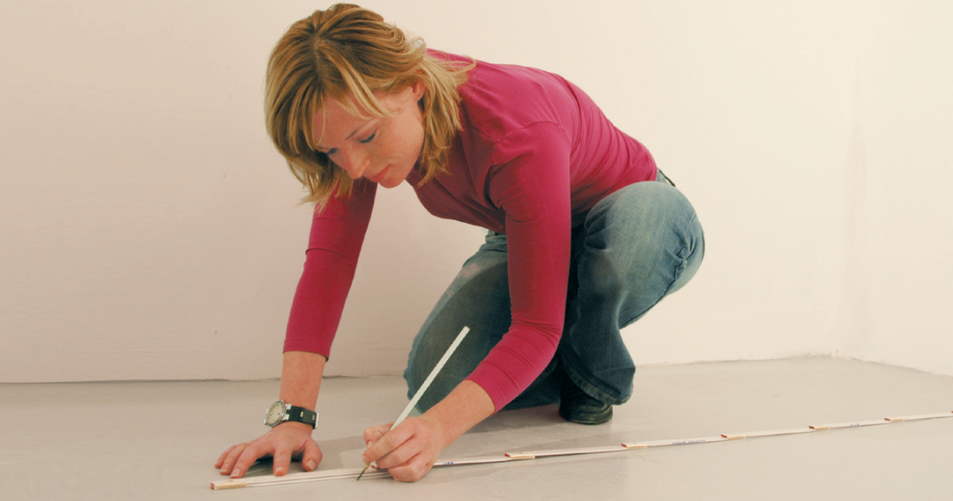 A padlón, a környező falakon és a mennyezeten is kijelöljük a válaszfal helyét. Ne feledkezzünk meg az esetleges ajtótokokról. Figyelem: az alapszerkezet (profilváz) helyét jelöljük ki, ezért a méretezés során a Rigips lapok vastagságát is fegyelembe kell venni.